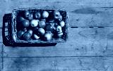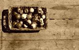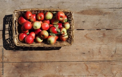 Top view of a wicker basket full of small yellow and red apples, under the sunlight . Old and worn table on background