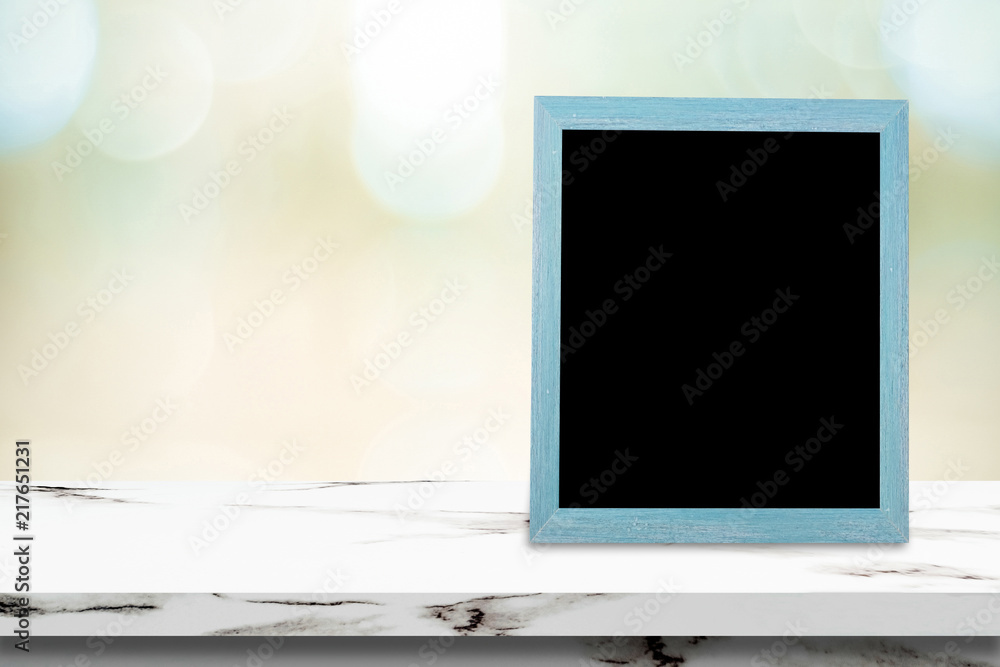 Blank chalkboard standing on table over blur cafe with bokeh background, space for text, mock up, product display montage