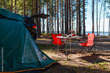 Family vacation, travel concept on wheels, a road trip, a table and chairs, a tent and a SUV with the back door open on site. Folding table and chairs with gas stove in the camping in the forest.