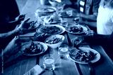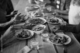 Human hands over plates with food during talk by dinner in modern cafe or restaurant