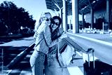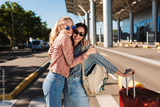 Two beautiful girls in sunglasses happily hugging each other while looking in camera with red suitcase and backpack on shoulder outdoor near airport