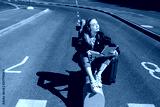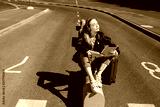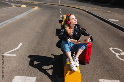 Cute girl in headphones listening music dreamily closing eyes with tablet in hand and suitcase near on road of airport