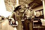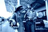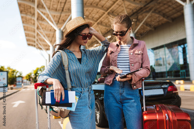 Young female friends in sunglasses holding passport with tickets while thoughtfully using tablet with airport on background