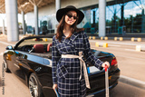 Pretty smiling girl in sunglasses and black hat happily looking in camera near airport with cabriolet on background