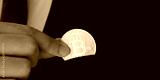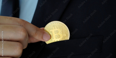 Hand holding bitcoins, cryptocurrency and blockchain concept