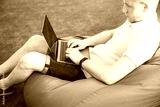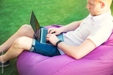 Young man in casual clothes sitting on pouf, working on laptop pc computer in park on green lawn outdoors. Mobile Office, Comfortable work place concept. Freelancer. Soft selective focus. Copy space.