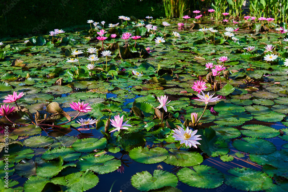 Lotuses in the pond. Many lotus flowers in the pond is full bloom. Beautiful lotus flowers is complemented by the rich colors of the deep blue water and bright green foliage surface. Pink water lily.