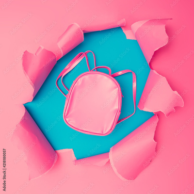 School bag with vivid pink torn paper. Burst hole background. Minimal abstract colorful wallpaper concept.