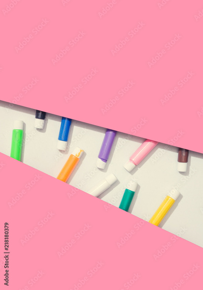 Abstract minimal pink background with school color paint. Geometric paper collage. Back to school concept. Flat lay.