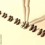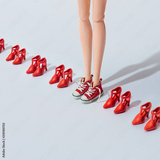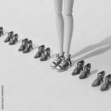 Girl teen doll in red sneakers with fashion high heels shoes. Minimal lifestyle concept.