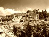 Tourists visiting the roman theatre of Malaga, Spain on a sunny day. The Alcazaba, arab castle in the background.