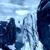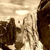 Portrait of a extreme plan travel for the handsome old man on the stone of the kjerag in the mountains kjeragbolten of Norway, selfie on a smartphone holding in your freedom hand