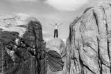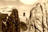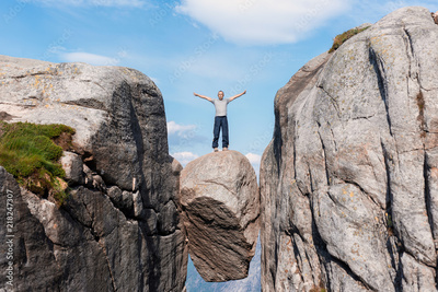 Portrait of a extreme plan travel for the handsome old man on the stone of the kjerag in the mountains kjeragbolten of Norway, selfie on a smartphone holding in your freedom hand