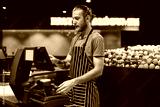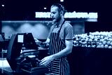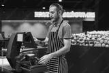 Young smiling seller in apron weighing strawberries on digital scales in supermarket