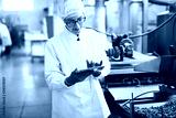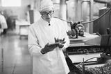 Young female worker in sterile clothes is checking quality of products in food factory.