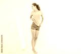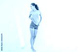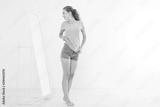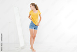 Shopping sale concept. Blonde girl in jeans and t shirt. Young woman in good body shape looking at mirror and lose weight. Copy space