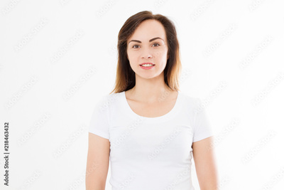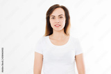 Young caucasian girl isolated on white background. Copy space. Mock up. Summer woman clothes blank template white t shirt.