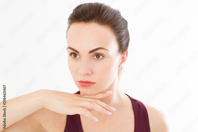 Skin care spa concept. Young caucasian woman macro face isolated on white background. Copy space. Anti aging concept
