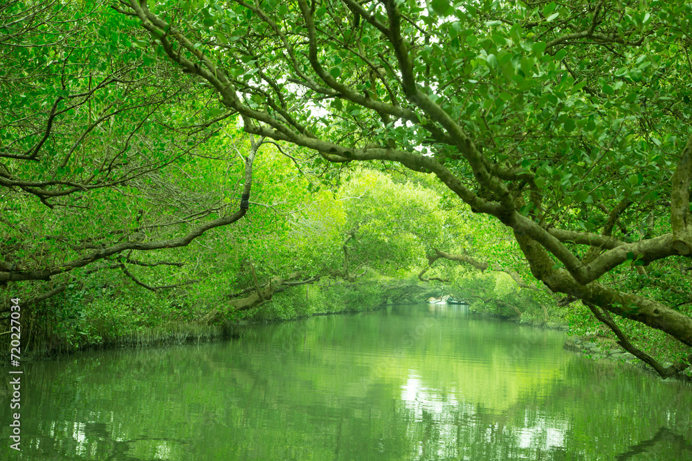 Beautiful landscape in park with tree and green grass field at morning.