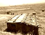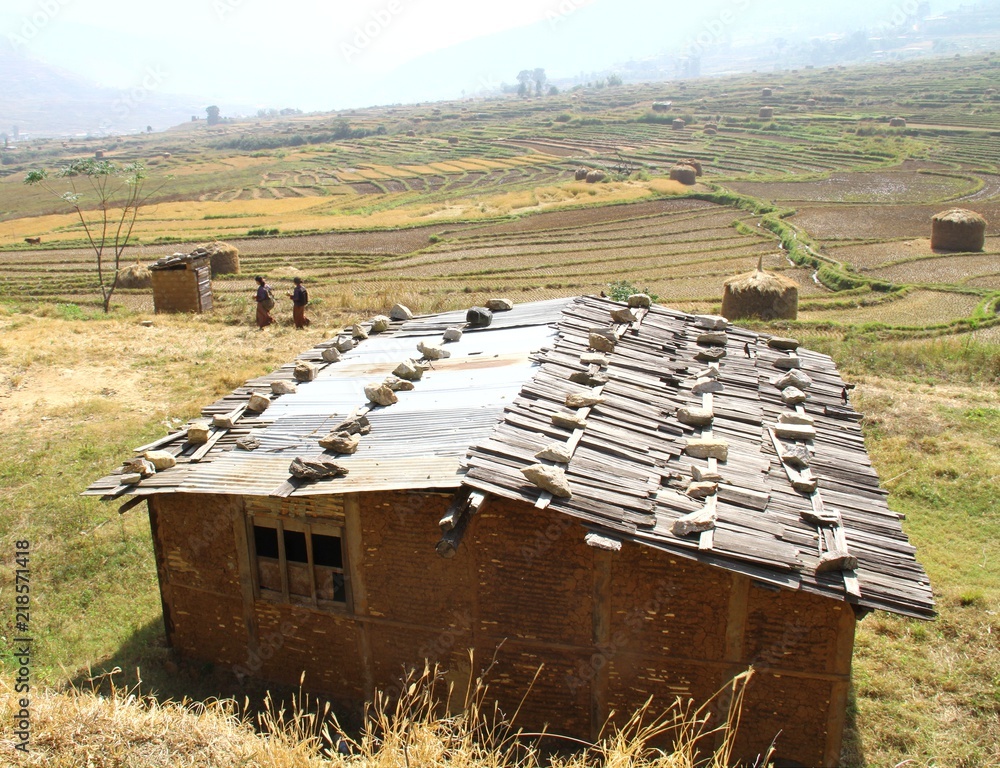 Two women in traditional bhutanese cloths walking near an old earthen House or Earth Shelter House with stones on the roof in small village at Punakha, Bhutan