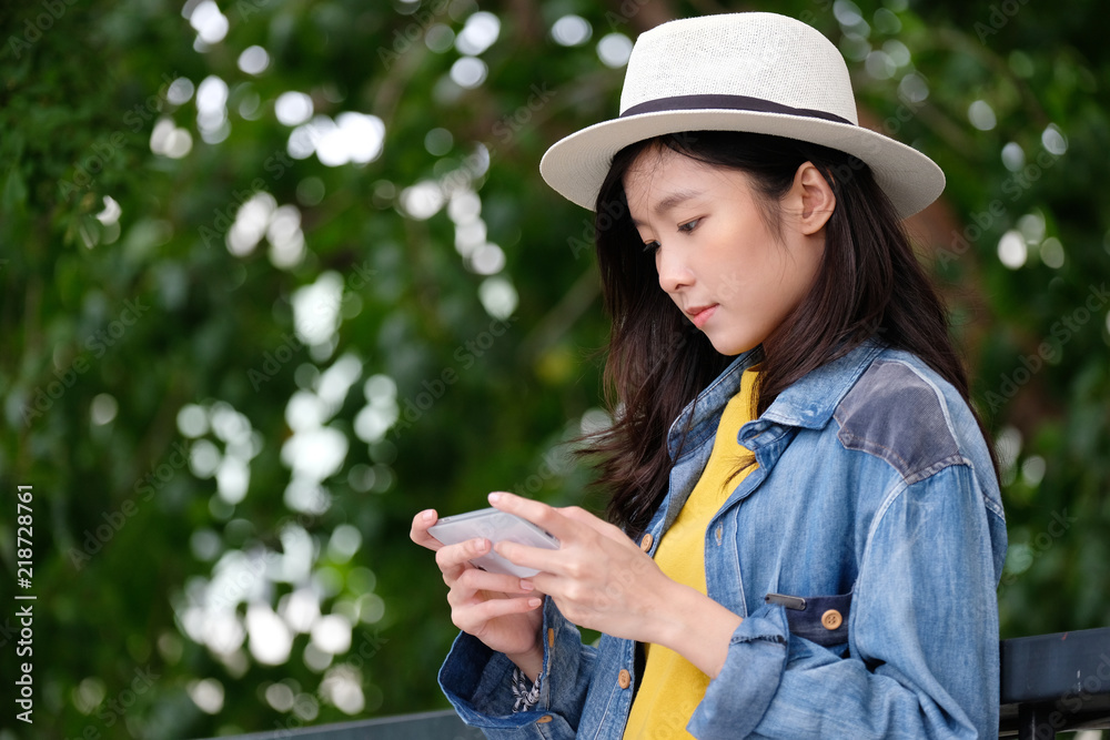 Young asian woman using smart phone in city outdoors background, people on phone, lifestyle