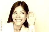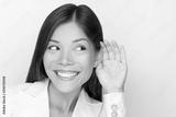 Listening ear: Business woman hearing secret gossip with hand to ear concept. Businesswoman listen to good news smiling. Beautiful happy mixed race Asian Caucasian young female professional in suit.