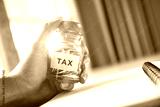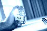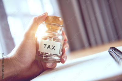 Hand holding coin in the jar with text TAX, copy space, sunlight effect.