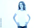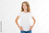 Young caucasian blonde girl isolated on white background. Copy space. Mock up. Summer woman clothes blank template white t shirt. Perfect skin. Skincare and makeup concept.