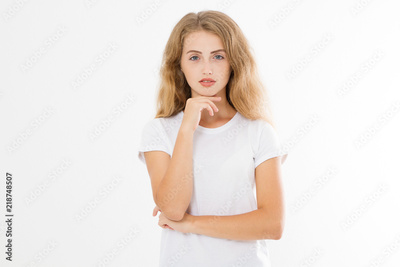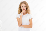 Portrait of caucasian blonde young woman with health hair and good skin isolated on white background. Copy space. Skincare and makeup concept.