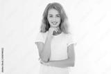 Portrait of caucasian blonde young woman with health hair and good skin isolated on white background. Copy space. Skincare and makeup concept.