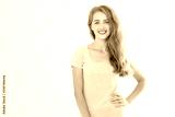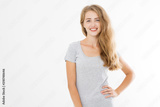 Young caucasian blonde girl isolated on white background. Copy space. Mock up. Summer woman clothes blank template white t shirt. Perfect skin. Skincare and makeup concept.