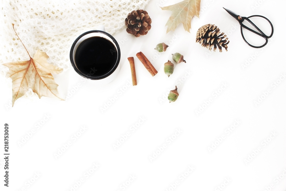 Autumn, fall composition. Cup of coffee, knitted blanket, autumn leaves, cinnamon sticks, pine cones, acorns and vintage scissors. White table background. Flat lay, top view. Thanksgiving cozy design.