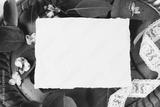 Styled stock photo. Feminine wedding still life composition, mockup scene. Closeup of blank cotton paper card, vintage silver tray, lace ribbon, hydrangea flowers and eucalyptus leaves and branches.