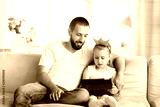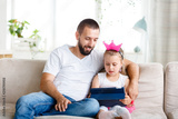 Little girl using digital tablet with her father