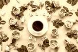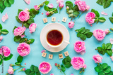 Top view creative layout with Tea time lettering with wooden blocks, cup of hot tea and fresh pink tea rose flowers, buds, petals, leaves on the blue background. Flat lay. Selective focus. Copy space.
