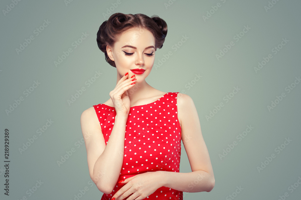 Pinup woman beauty portrait vintage retro girl model in polka dot dress