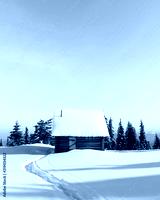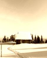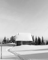 Fantastic winter landscape with wooden house in snowy mountains. Christmas holiday concept. Carpathians mountain, Ukraine, Europe
