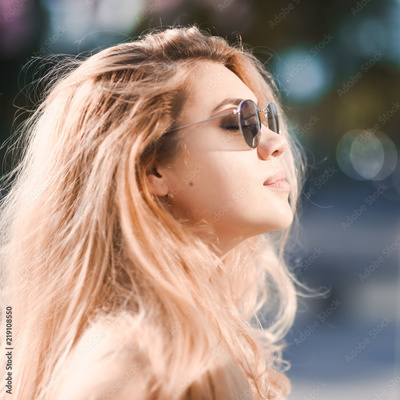 Portrait Beautiful young blonde girl in sunglasses with puffy lips and sexy feminine body posing on the street with pink flowers on the background on sunny day