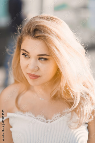 Portrait Beautiful young blonde girl in modern hat with full lips posing and smiling on the street lifestyle on sunny day