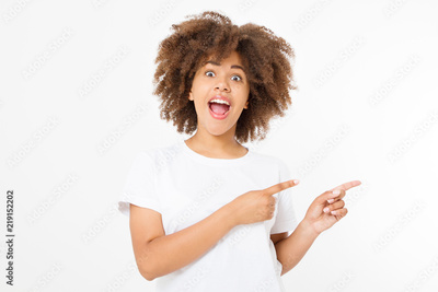 Young african american happy woman showing copyspace pointing on isolated white background. Summer fun. Template, blank shirt. Afro curly hairstyle.