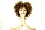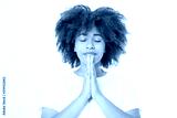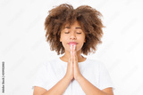 Praying young afro american girl. African woman in summer shirt isolated on white background. Copy space. Mock up. Make a wish