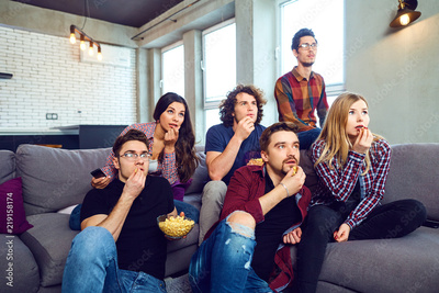 A group of friends eating pizza wathing tv sitting on the couch in the room.