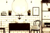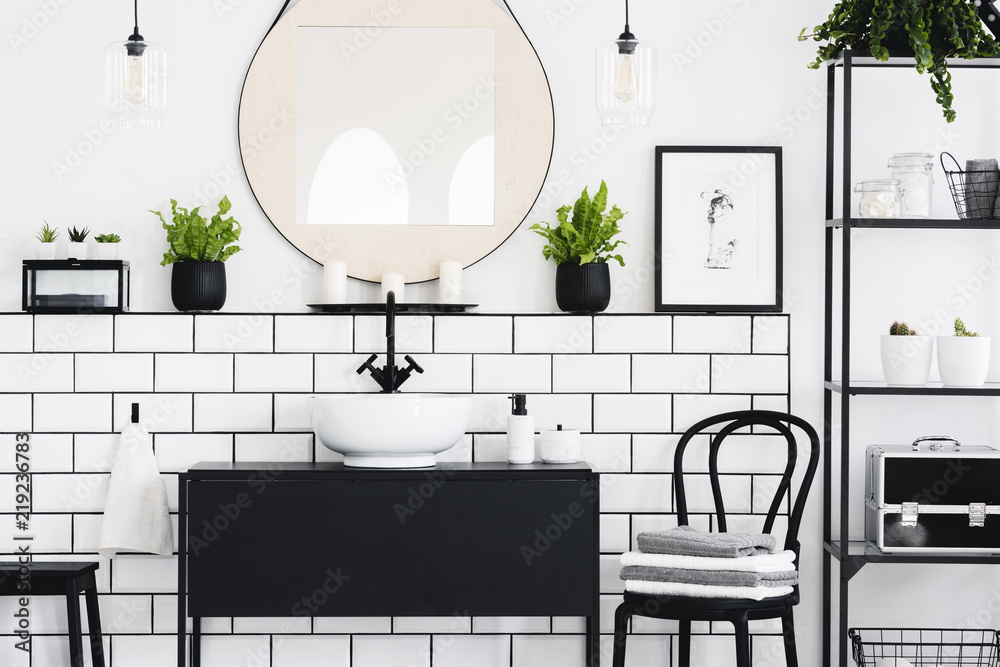 Real photo of black and white bathroom interior with a mirror, cupboard, chair and plants