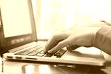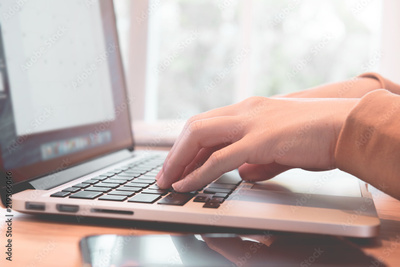 Closeup woman's using on a laptop on a wooden desk with sunlight. female hands typing on the notebook keyboard, Young people work multi devices concept.