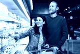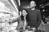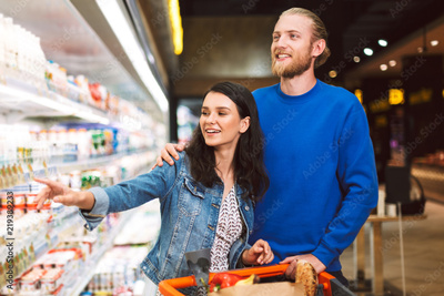 Young joyful couple with trolley full of products happily choosing dairy products in supermarket