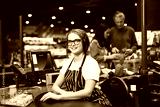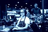 Young smiling cashier in eyeglasses and striped apron happily looking in camera while working in modern supermarket with customers on background