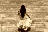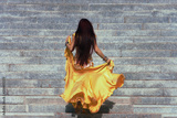 A girl in a gold traditional oriental costume for belly dancing will climb the stairs with her back to the viewer. The wind develops her hair and hem dresses.