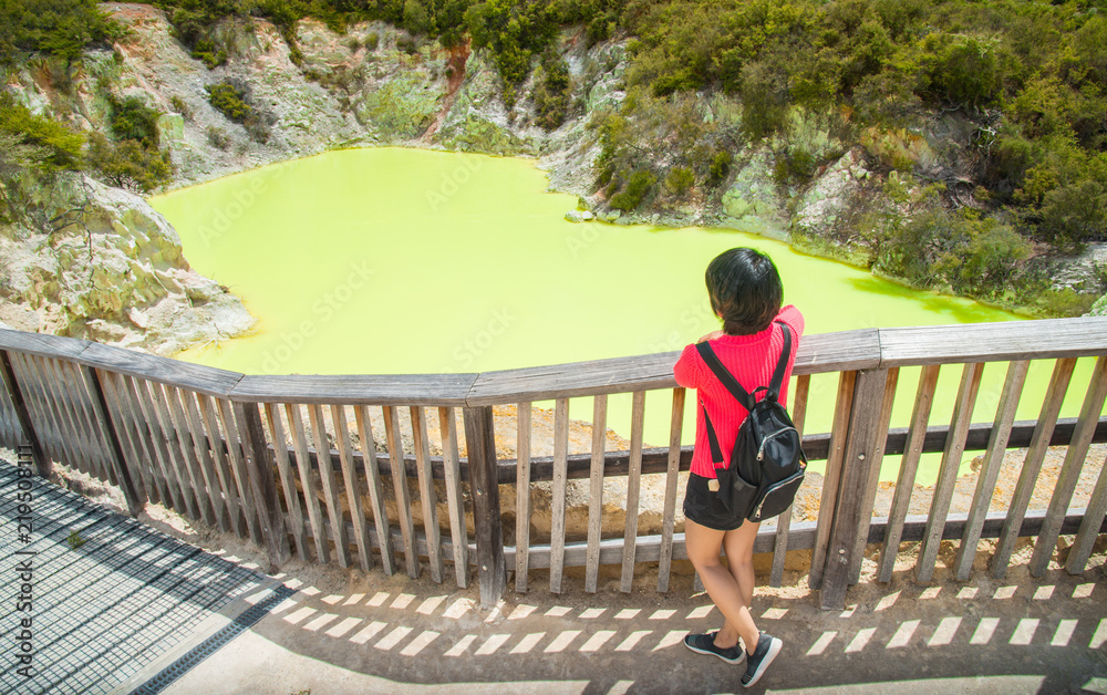 Asian tourist looking to Devil's Bath the electric green sulphur lake at Wai-O-Tapu wonderland in New Zealand.