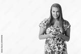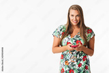 Pretty smiling girl in colorful dress dreamily looking in camera using cellphone over white background isolated. Plus size lady