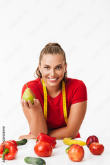 Beautiful smiling girl with measuring tape on neck holding pear in hand while happily looking in camera with fruits and vegetables near over white background. Plus size lady